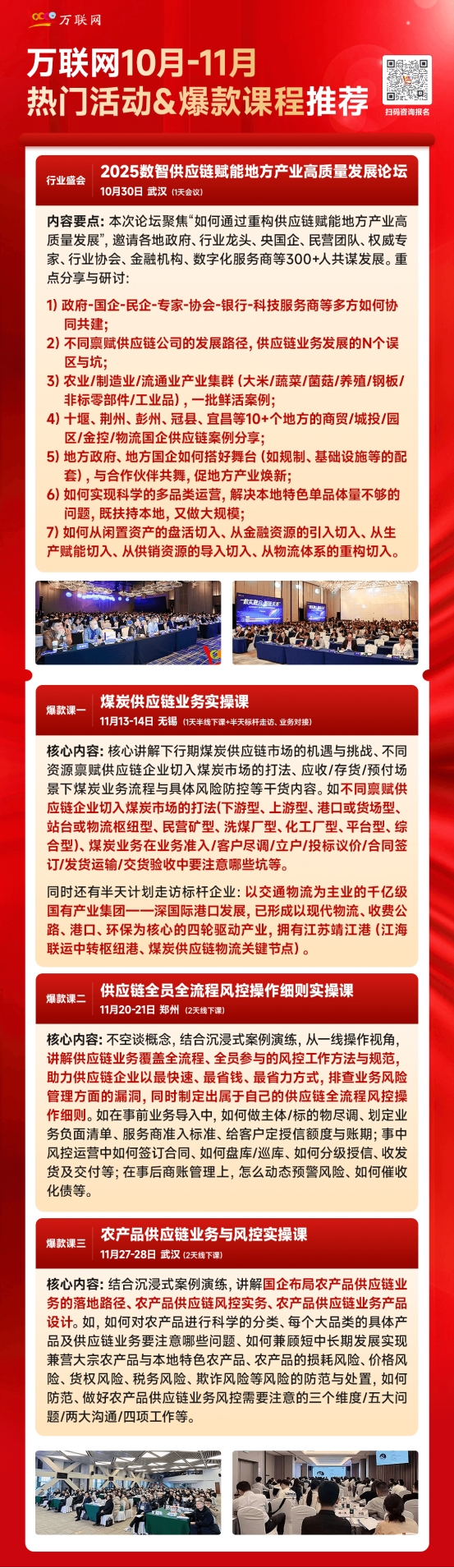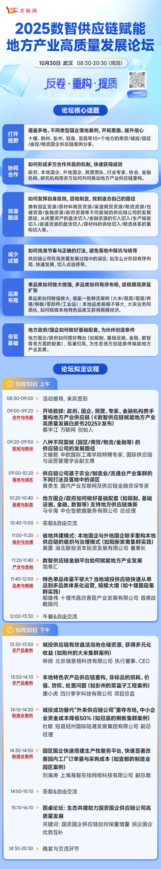 如果你还在为产业园区的招商引资/经营管理而苦恼,想用供应链做好招商却不知从何下手、想学习一下市面上已经验证过的模式与实践,那么就不要错过万联网将于2025年10月30日在武汉举办“2025数智供应链赋能地方产业高质量发展论坛”,300人规模、82%决策层参与、央国企居多(城投、产投、经投、交投、商投、铁投、水投、金控、物流、供应链公司等)。