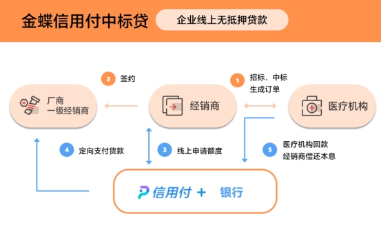 金蝶征信推出的「金蝶信用付」中标贷融资服务专为医疗器械流通行业设计,旨在帮助通过公开招投标渠道中标的经销商快速获得资金支持,无需抵押担保,融资款项由金融机构直接定向支付给上游供应商,打破垫资困境。